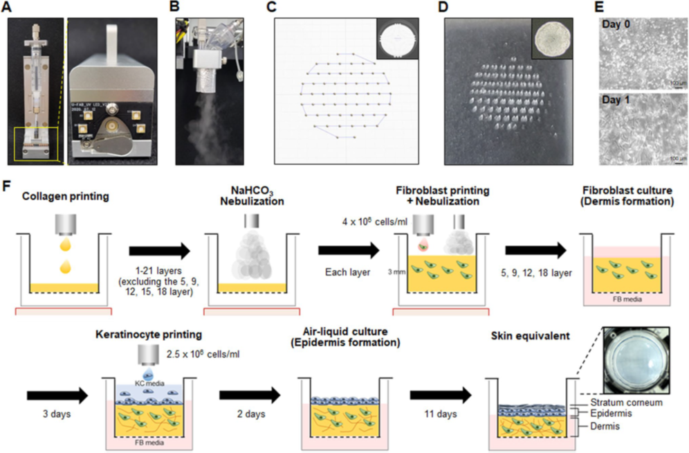 This study presents a novel approach to fabricating human skin equivalents (hSKE) using droplet-based 3D bioprinting combined with nebulization technology. Unlike traditional manual or extrusion-based methods, this technique allows for high reproducibility, uniformity, and improved cell viability in skin constructs.