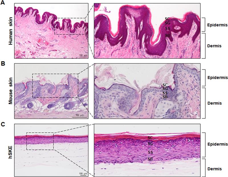 - Bioprinted hSKE Mimics Native Skin: hSKE fabricated using droplet-based bioprinting and nebulization techniques can effectively replicate the dermal and epidermal architecture of native skin, including the keratinization process of keratinocytes within the epidermis.Â