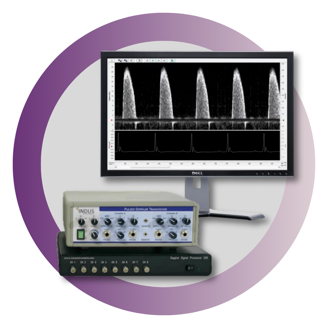 The Doppler Flow Velocity system is used in this study primarily to quantify blood flow velocity in the ophthalmic artery. However, the DFVS can be used to measure the blood flow velocity in any vessels such as carotid, femoral, or renal arteries, making it a versatile system for systemic hemodynamic assessments. The DFVS is also commonly used for preliminary cardiac analysis, global arterial stiffness measurements, validation of surgical models such as Transverse Aortic Constriction models, and validation of specific ligation models.