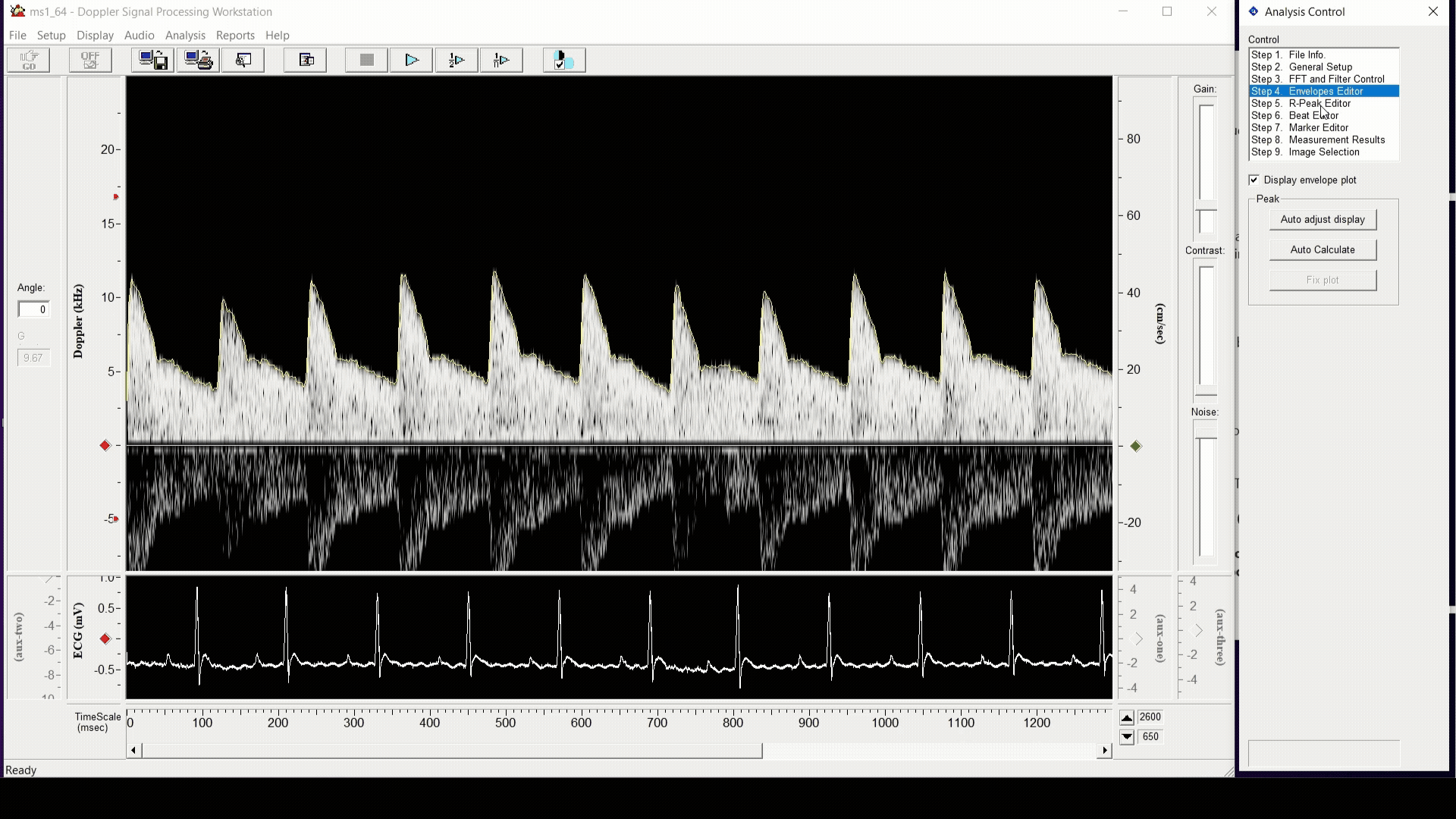 Pulsed Doppler signals from the PDT are digitized at high sampling rates by the DSD and the workstation software. The acquired signals are processed using a fast Fourier transform algorithm and displayed as real-time grayscale Doppler flow velocity spectrograms. The workstation software permits recording and analysis of these spectrograms, ideal for report generation and publication purposes. This system has been successfully used in publications with mice, rats, bats, naked mole rats and other small animals. It is also capable of measuring blood flow velocities in larger animals using our implanted extra-vascular Doppler cuff probes.